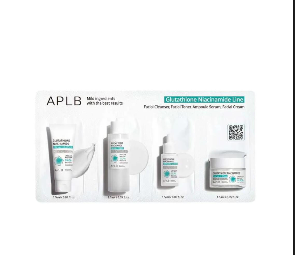 Discover the perfect skincare routine with the APLB Glutathione Niacinamide Skin 4 Types Sachet Set, a convenient trial kit designed to brighten, hydrate, and rejuvenate your skin. Each sachet is enriched with glutathione and niacinamide, powerful brightening ingredients that even out skin tone while improving texture and radiance. With four types of formulas included, this set allows you to experience targeted care for different skin needs anytime, anywhere.