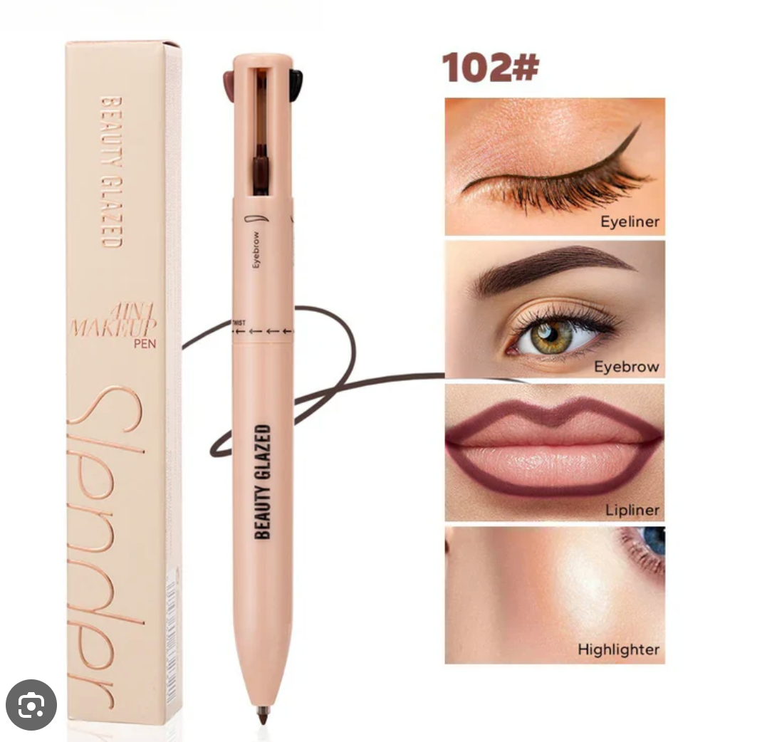 Declutter your makeup bag with the Beauty Glazed 4-in-1 Makeup Pen. This innovative multi-use pen features four essential makeup shades in one sleek design: Eyeliner, Eyebrow Pencil, Lip Liner, and Highlighter. Perfect for quick touch-ups on the go!