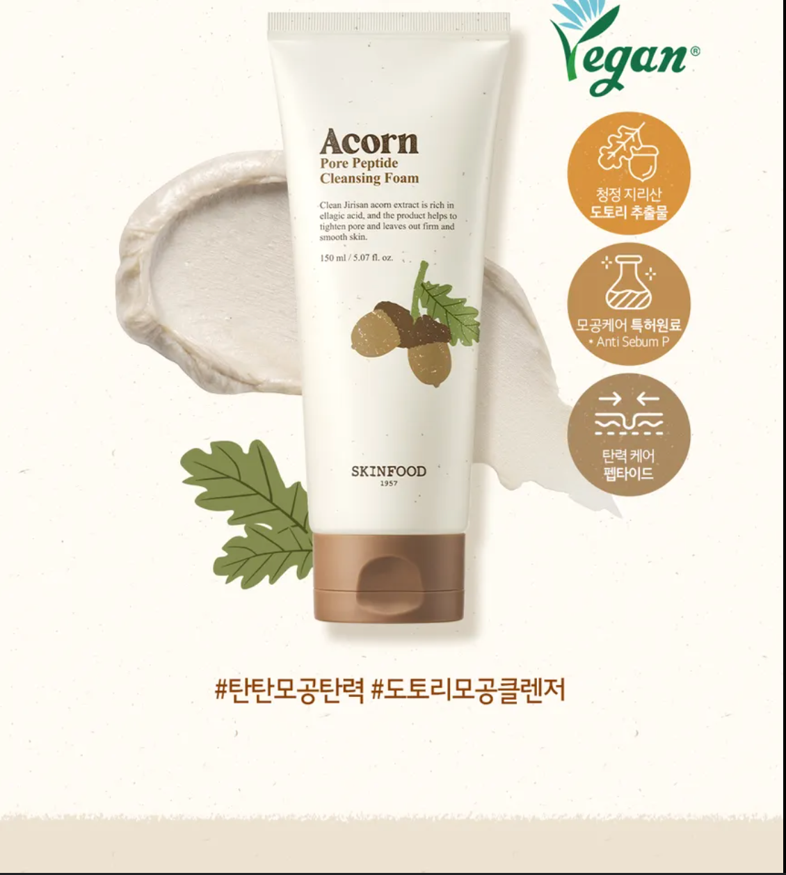 Purify and refine your skin with the SKINFOOD Acorn Pore Peptide Cleansing Foam, a rich foaming cleanser designed to target excess oil and enlarged pores. Powered by acorn extract and peptides, it gently removes dirt, sebum, and impurities while supporting skin’s elasticity and smoothness. The creamy lather leaves your skin feeling fresh, balanced, and soft without over-drying.