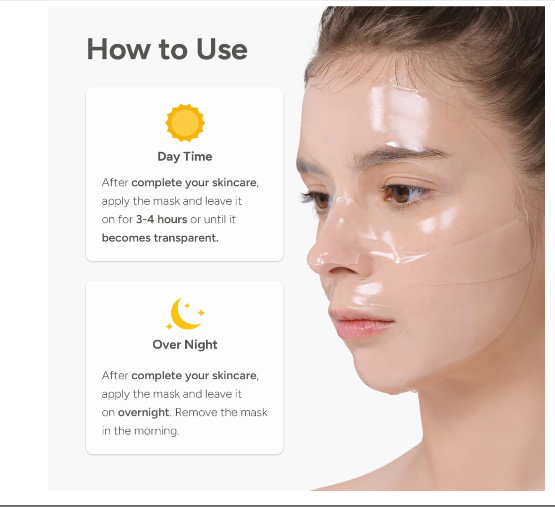 [OVERNIGHT HYDRATING MASK] Perfect for nighttime use, the collagen hydrogel sheet becomes transparent and fully absorbs into the skin within 3 hours, making it ideal for overnight care. Wake up to skin that feels rejuvenated, firm, and glowing.